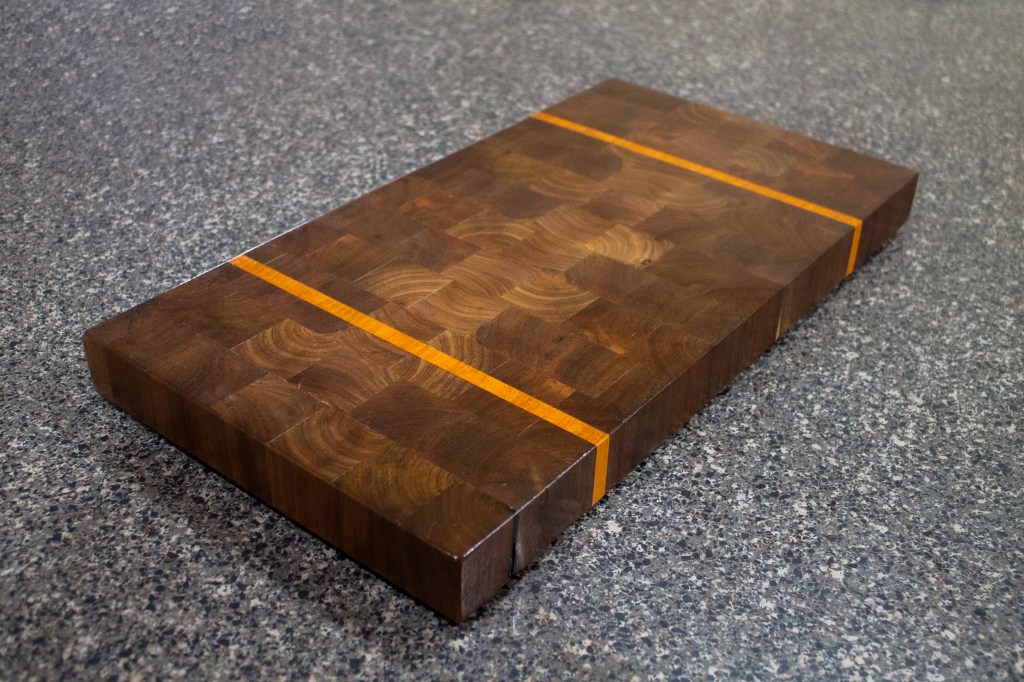 Made of beautiful Walnut boards and sharp bands of Mahogany, The Kellie Cutting Boards were carefully assembled in a series of glue-ups and cross-cuts to create the staggered end grain pattern of Walnut blocks interrupted only by the bands of Mahogany.