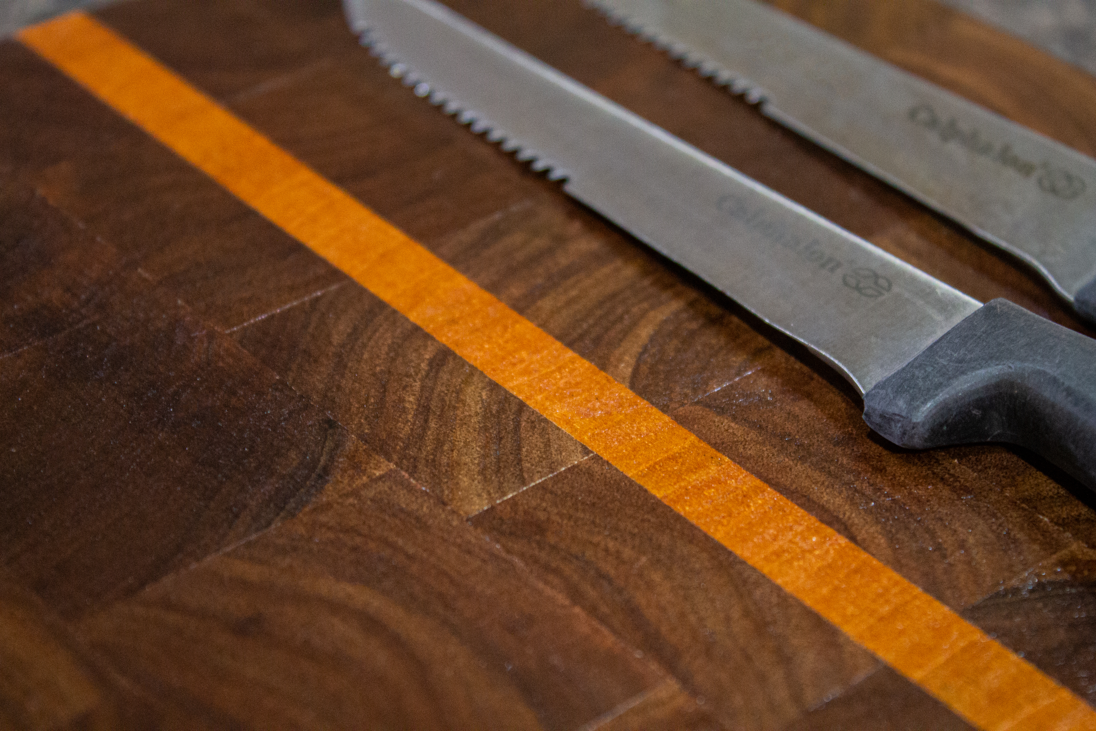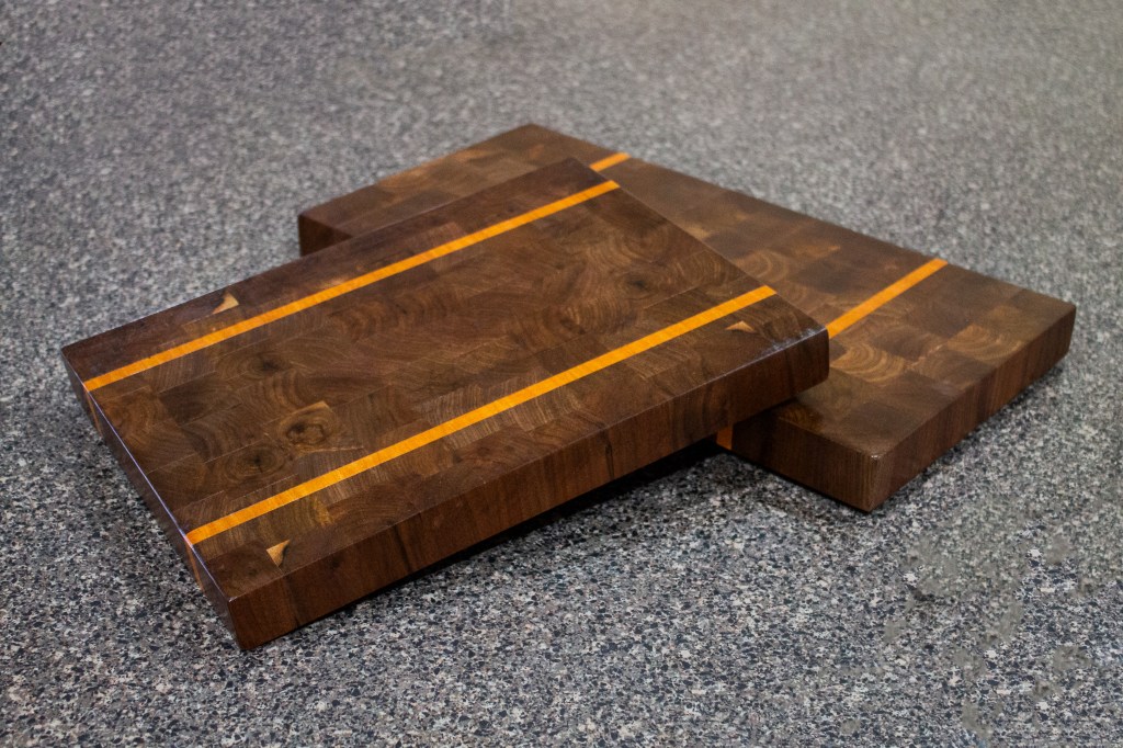 The twin cutting boards each feature unique details, like the lightly colored sapwood bits luckily captured in the smaller board, or the central stagger of slightly lighter walnut pieces seen on the larger board.