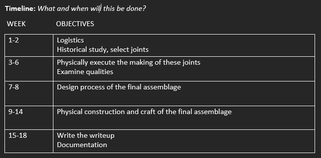 It is infeasible to attempt a physical construction as called for by this inquiry on the scale of an entire building, but the scale of a furniture piece is fitting for a project of this ambition. Even though Japanese joinery evolved as an architectural necessity, the final assemblage will likely be a furniture piece of some sort, or at least, on the scale of one. Even in the scale of furniture, the applications for Japanese joinery are well understood and highly specific. While initially invented for the most practical of structural purposes, many Japanese joinery techniques have found their way into the furnituremaker’s arsenal, as their structural potential and desirable aesthetic qualities free from unsightly fasteners have made them a go to for high-end woodworkers.