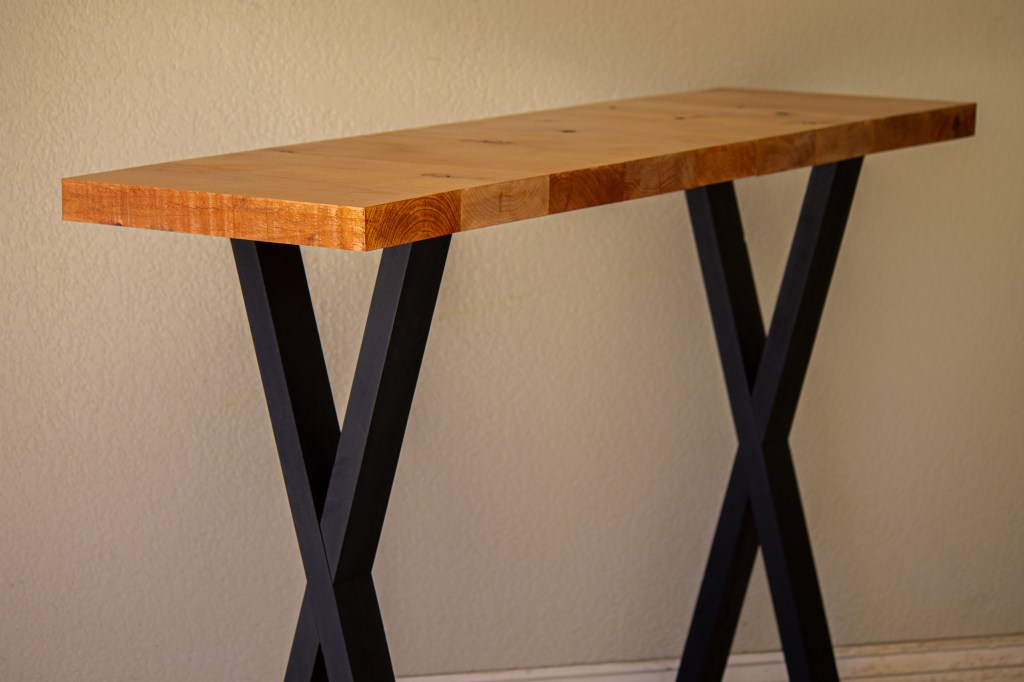 The rugged top and contrastingly sleek legs of the London Entryway Table make this piece a great addition for a foyer. I enjoyed preserving the the mill-sawn sides of the recycled Oak plank top, giving the table’s front edge an eye-catching rustic detail, with pops of character and contrast.