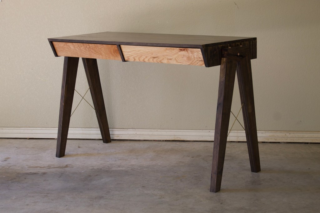 The Jacob desk was designed to accommodate a large volume of drawer space, and to look good doing it. To achieve this, the desk features two full length and width drawers, framed by striking angles and accents of bronze and oak.