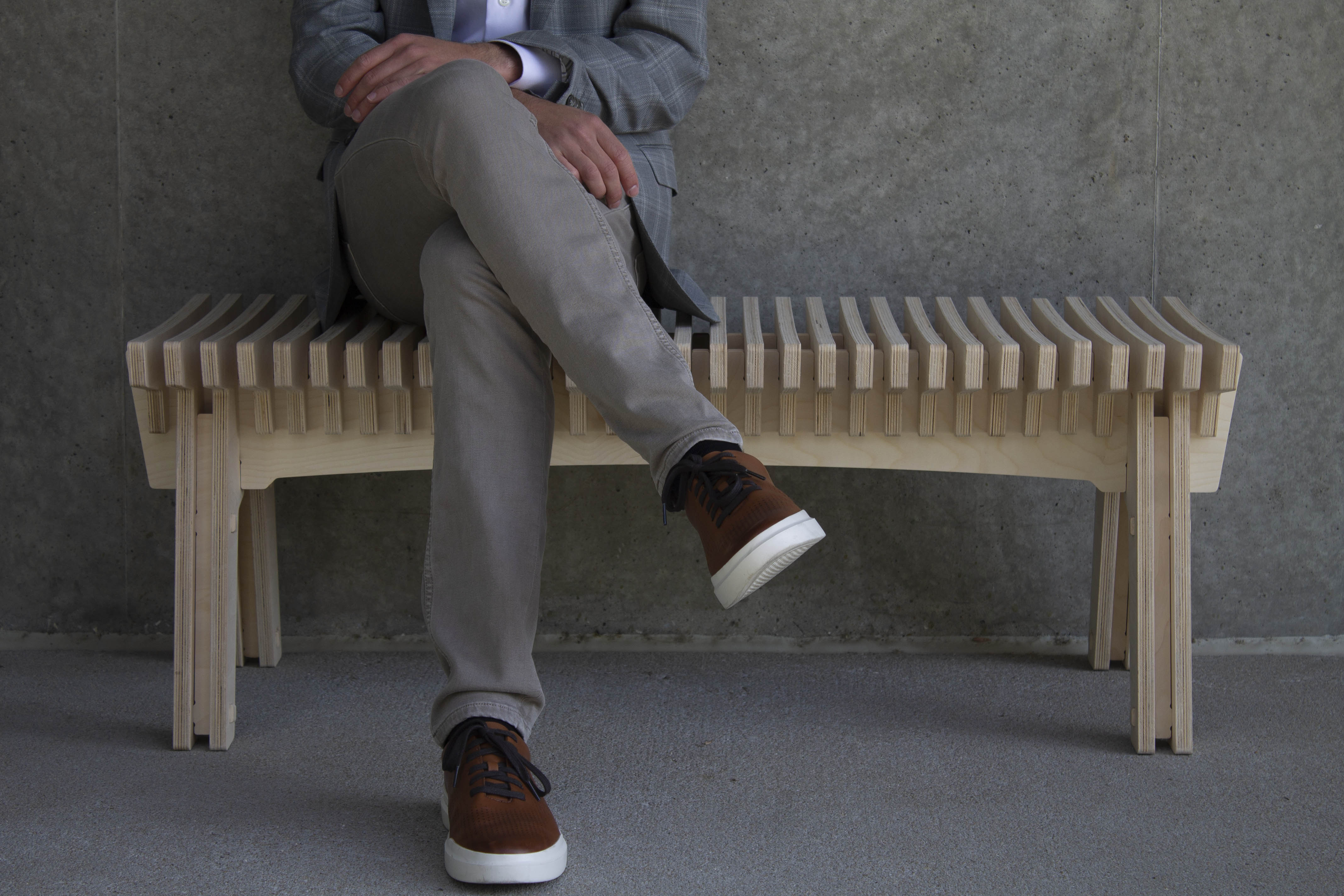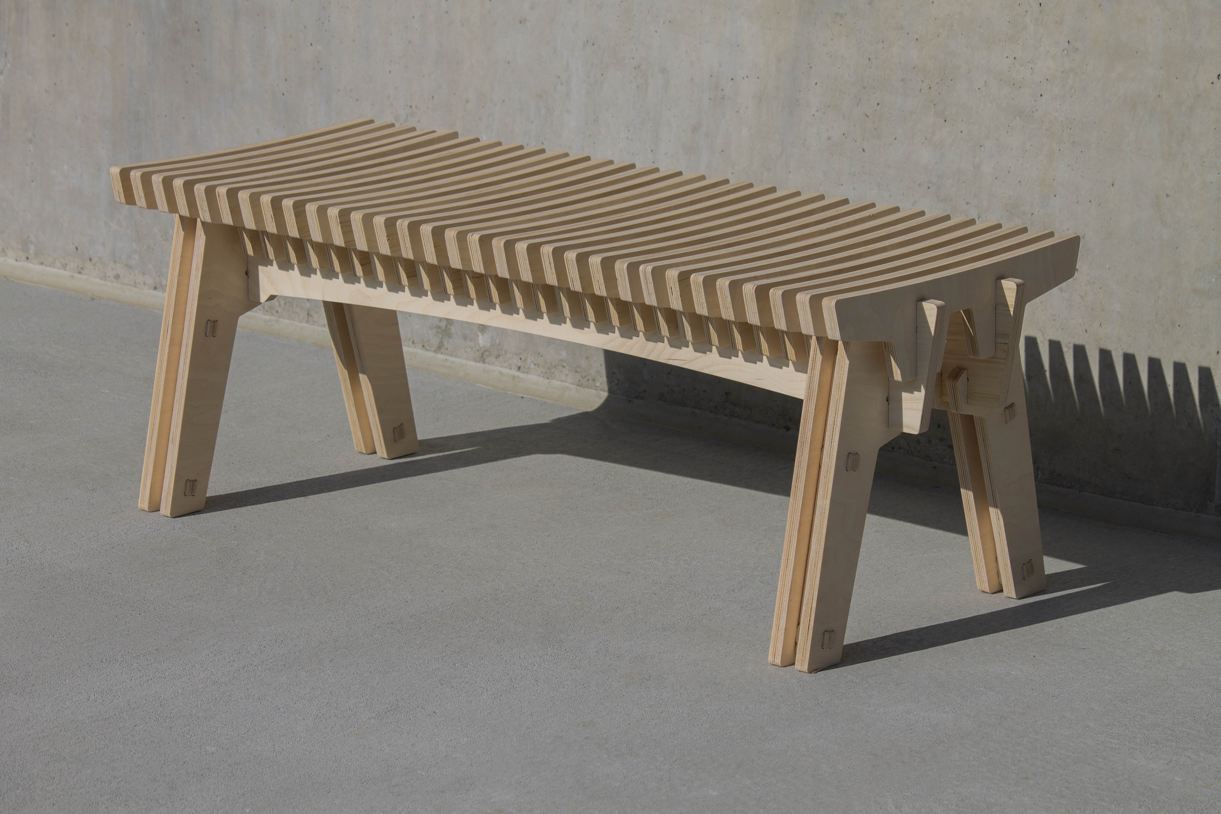 Kaiten, Japanese for “rotate” aptly describes the mechanism by which this bench, assembled exclusively by CNC cut Japanese joinery methods, is put together. As the two spines rotate up into place, they are conversely pinned back apart by the seat slats which bracket down from above, locking the assemblage together. Because the connections are so simple, yet remarkably strong and reversible, the bench can be assembled completely in as little as three minutes, from a pile of less than 40 individual pieces.