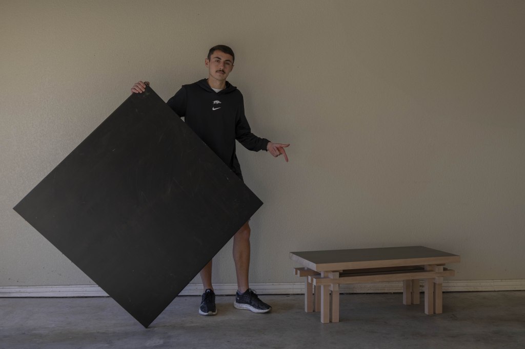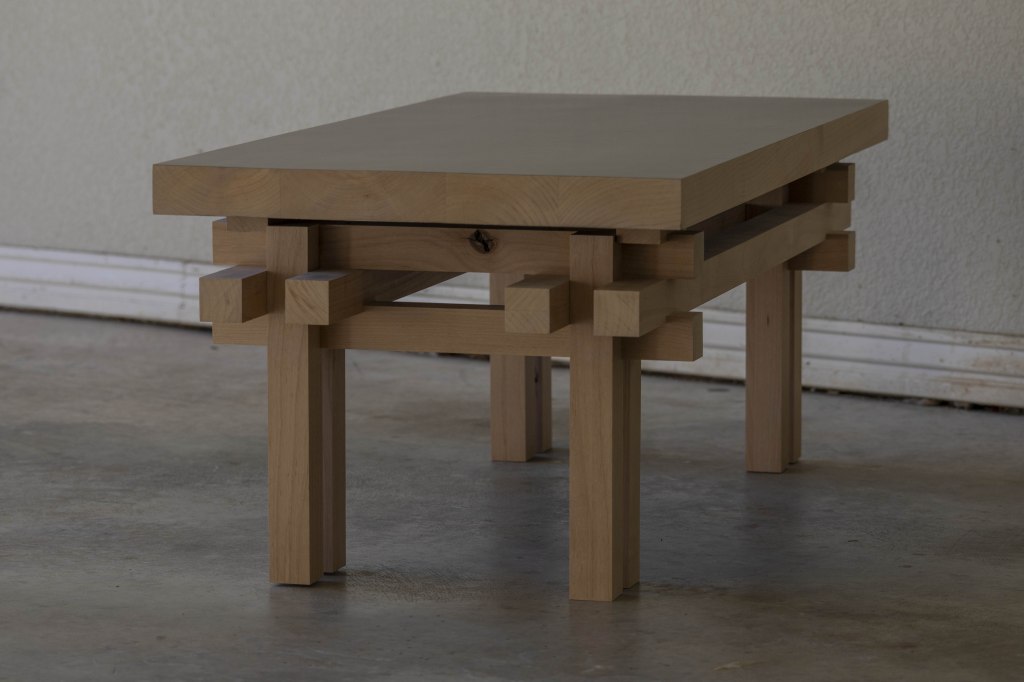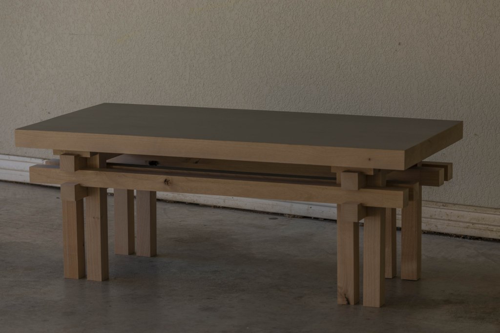The result is the Gomi Table, pictured here. In order to build it, the original slab’s damaged edges were trimmed off on the table saw. From there, the entire remainder was cut down the middle to size. The finer of the two resultant slabs became the top, and the other half was further processed via saw and planar into the leg assembly components.