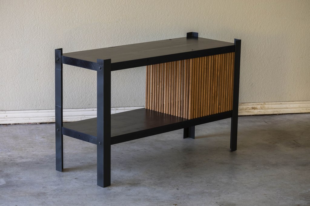 The cabinet section to the right was made of poplar dowels- spaced 1/4” apart in order to allow sufficient airflow for the subwoofer housed inside. My testing concluded that the housing did not inhibit acoustics in any way, while allowing the subwoofer and many cables to be hidden from plain sight.