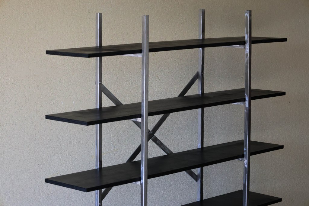 Here is my take on the Enetri Shelf, which I made of painted 3/4″ plywood panels for the shelves, and a twin set of welded 1″ steel square-tube frames connected with a cross brace. This cross brace, fixed to the frames via 4 simple bolts, allows the entire shelf to disassemble and pack flat upon removing these bolts in mere minutes for easy transport.
