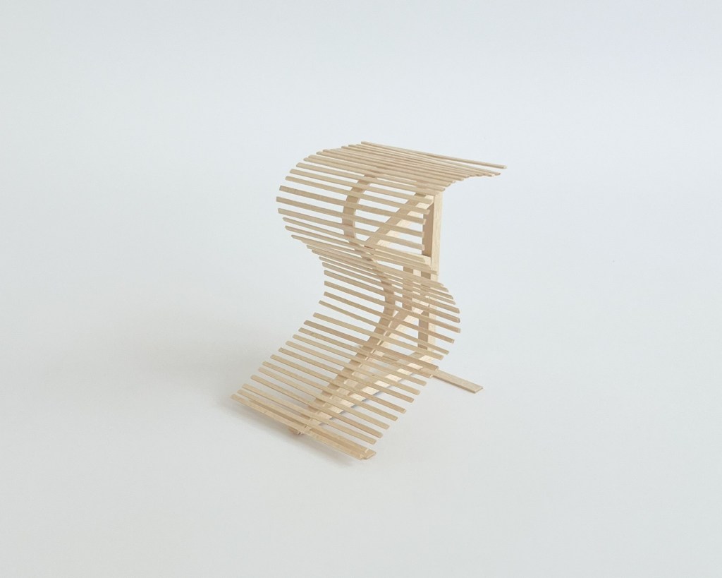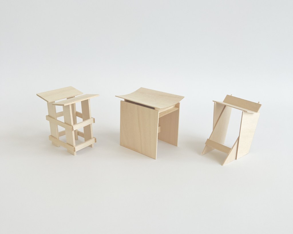 It is from these prototypes that a final design was modeled in rhino and produced at full scale in the woodshops here at the Sam Fox School. In my case, the third stick concept would eventually become the final stool, “Stool-R”, featured in my next post.